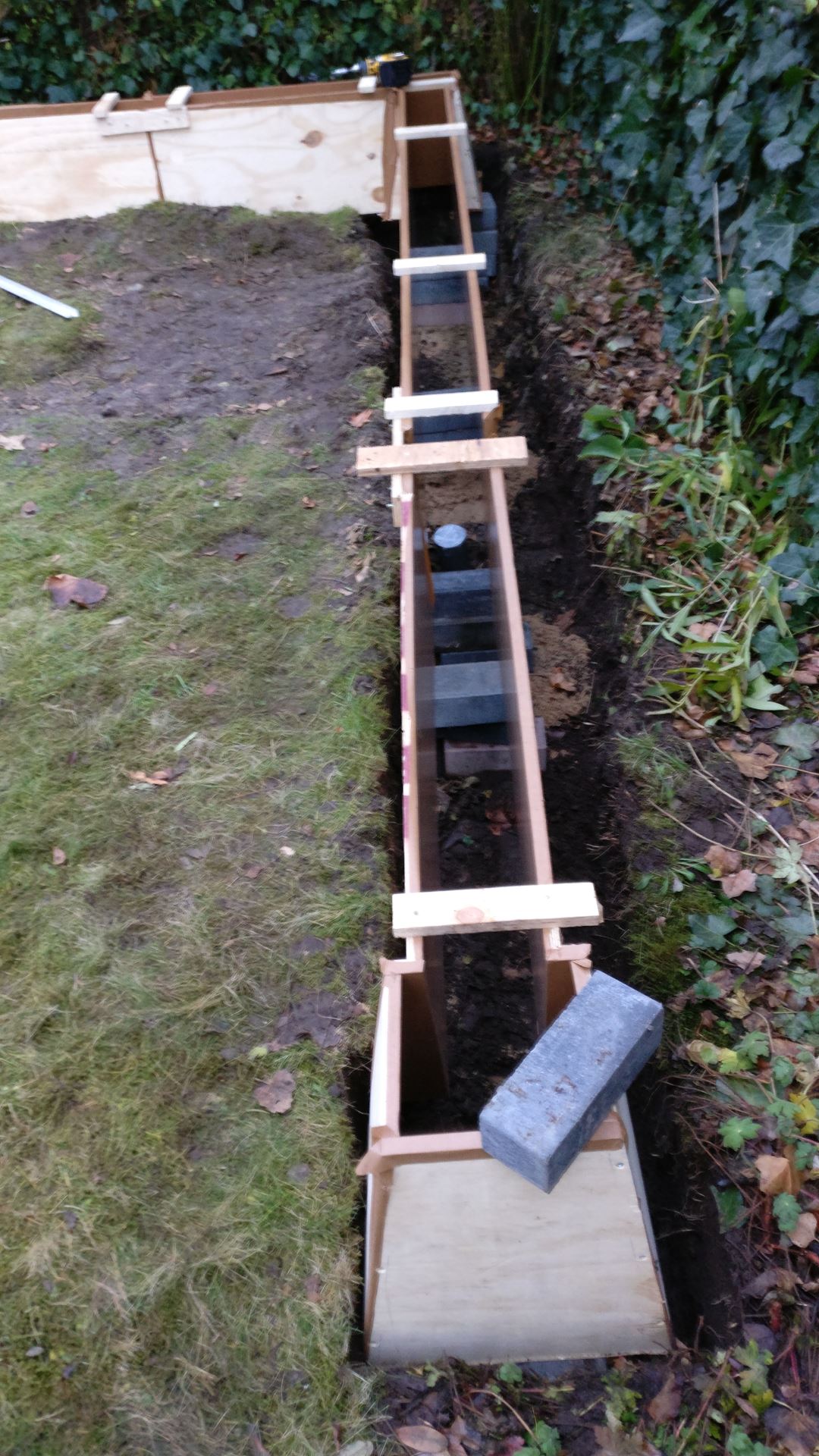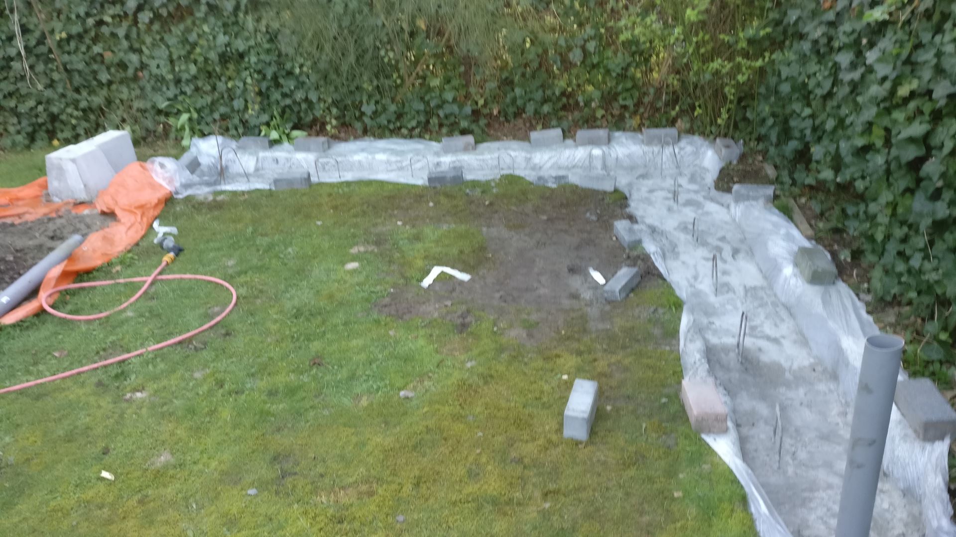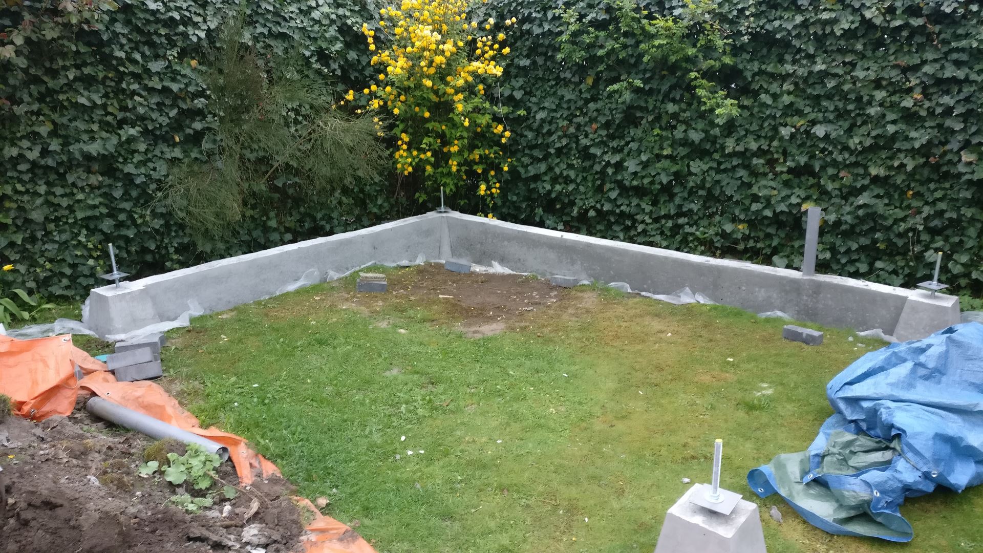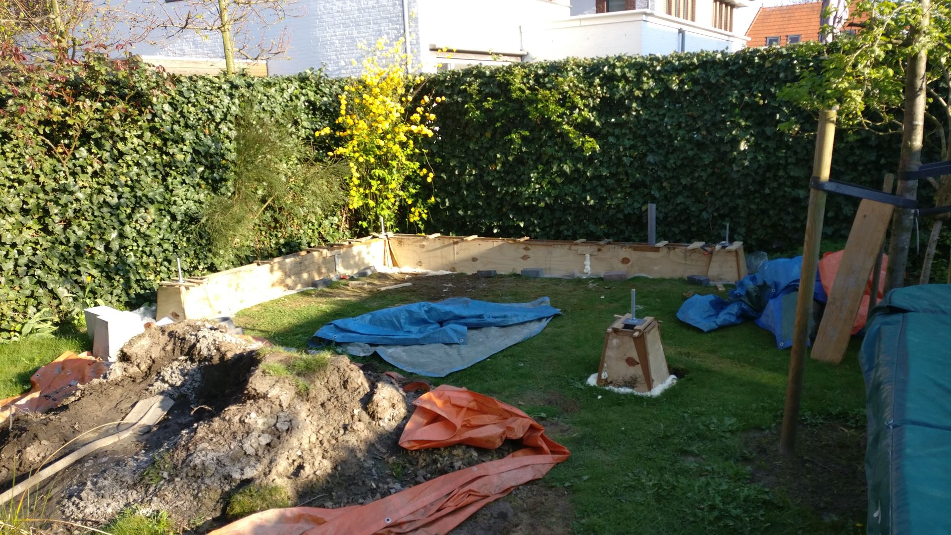 Feestdagen en weersomstandigheden maken dat er een tijdje niet verder kan worden gewerkt. De bekisting die al klaar is heb ik vanwege de grote afmetingen in de tuin gelegd met een zeil erover.