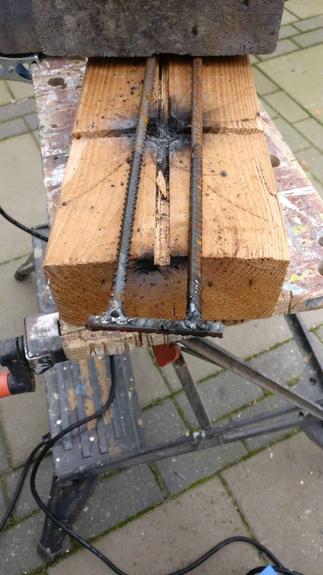 een leermoment. Naast deze staven buig ik ook een aantal staven in een soort driehoek-vorm welke ik daarna aan elkaar las tot een geheel. Deze driehoek-staven moeten in de onderste beton laag komen waar de bovenlaag aan kan hechten.