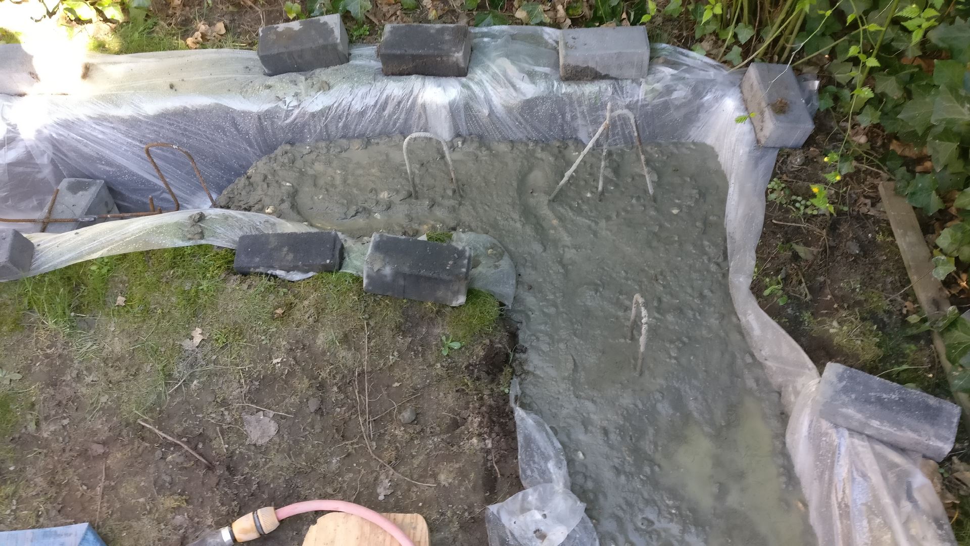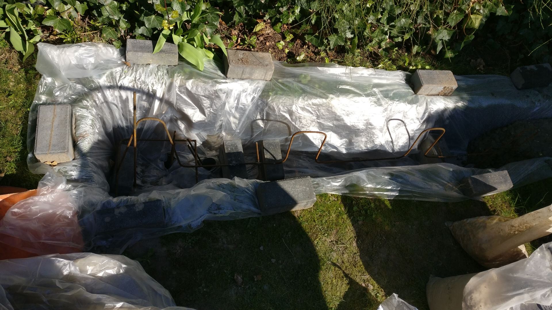 Om te zorgen dat het water uit het beton niet in de grond kan wegvloeien, heb ik een aantal grote doorzichtige plastic zakken in de geul gelegd. De betonijzers leg ik op stenen in de geul op het plastic. Dan is het tijd om te mixen.
