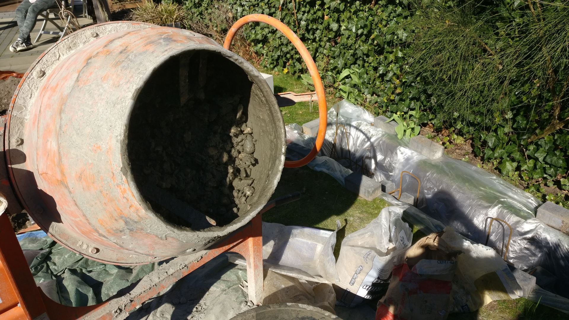 was. Als de betonmolen lekker stond te draaien, gebruikte ik een handschepje om wat in de gestorte beton te peuren zodat de lucht kan ontsnappen.