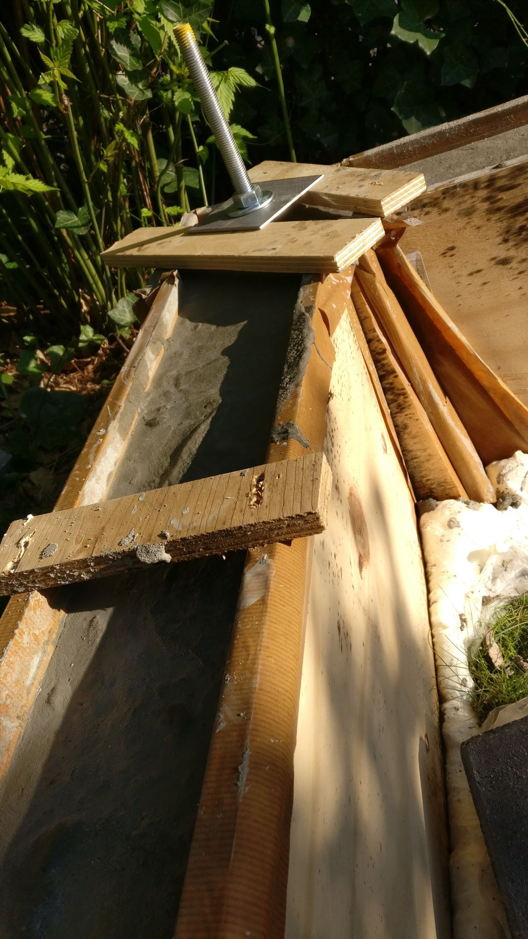 en kwaad als het gaat een 20mm dik draadeind in de beton op alle hoeken. Het draadeind zit zo'n 25cm in het beton en het is onmogelijk om deze en loodrecht en in het midden te krijgen. Hier worden later de houten staanders op geplaatst.