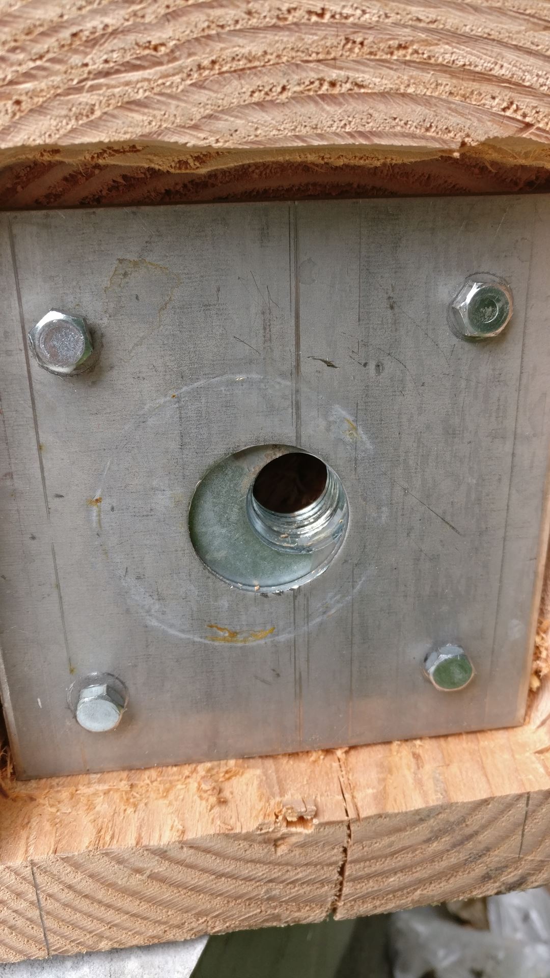 Zoals al eerder vermeld was ik me bewust dat ik de draadeinden niet precies recht in het midden zou krijgen, daarom moet bij de bevestiging van de staanders wat zijdelingse beweging mogelijk zijn om de staander precies over de poer uit