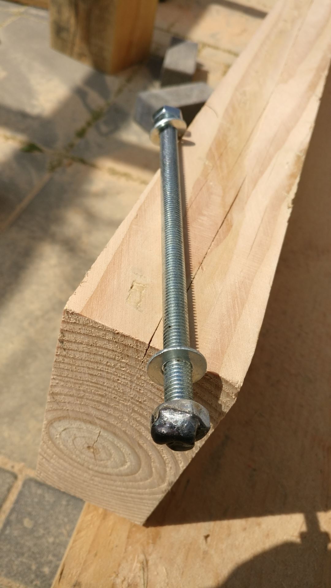 Het is tijd om de balken rondom te plaatsen die de afmetingen van het uiteindelijke dak gaan bepalen. Deze balken schroef ik recht-toe-recht-aan vast met een draadbout