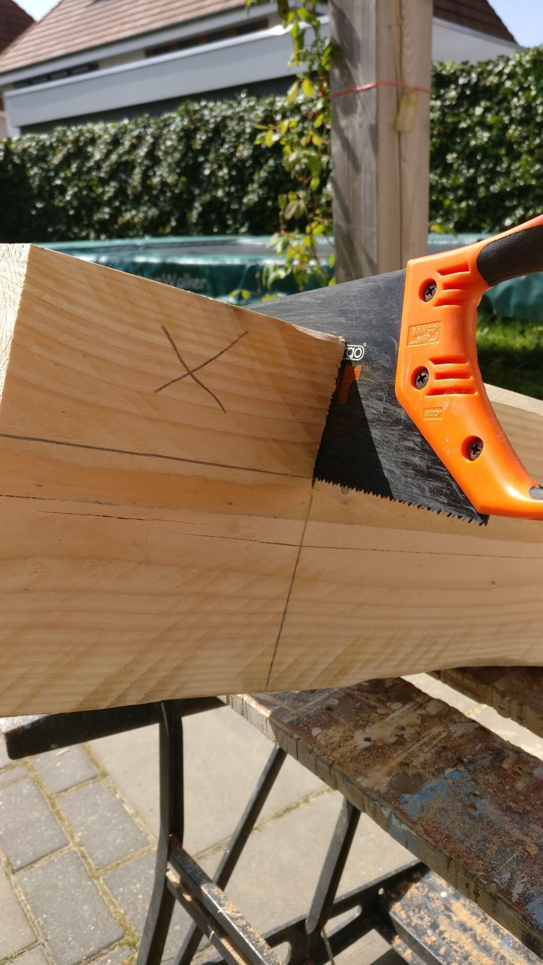 Ik meet de hoogte van de eerste paal met de hand en zaag hier boven de hoeken eruit waar later de liggers op komen. Dit is een erg vervelend klusje. Ik moet zo'n 13cm inzagen en dit is teveel voor een cirkelzaag. Een reciprozaag zou dit wel halen, maar ik heb er geen vertrouwen in dat dit een mooie strakke zaagsnede zal worden. Daar toch maar met de hand zagen. Dit klusje kost me 1.5 uur per staander van mijn leven.