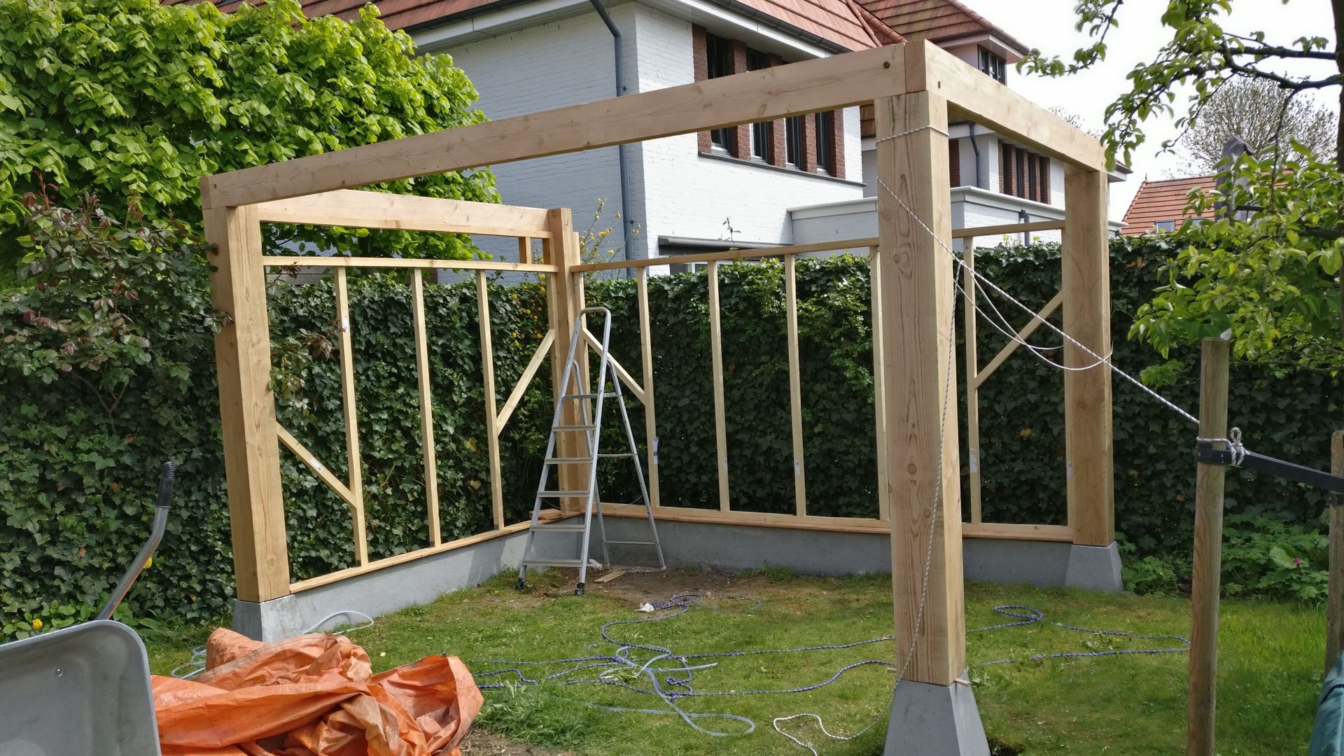 Nadat de 3e staanders is geplaatst timmer ik ook het frame voor de lange wand alvast. Daarna plaats ik de laatste staander. De afdek plank van de lange wand blijkt niet geheel mooi te liggen. Dit komt omdat de bovenkant van het beton veel te ruw en oneffen