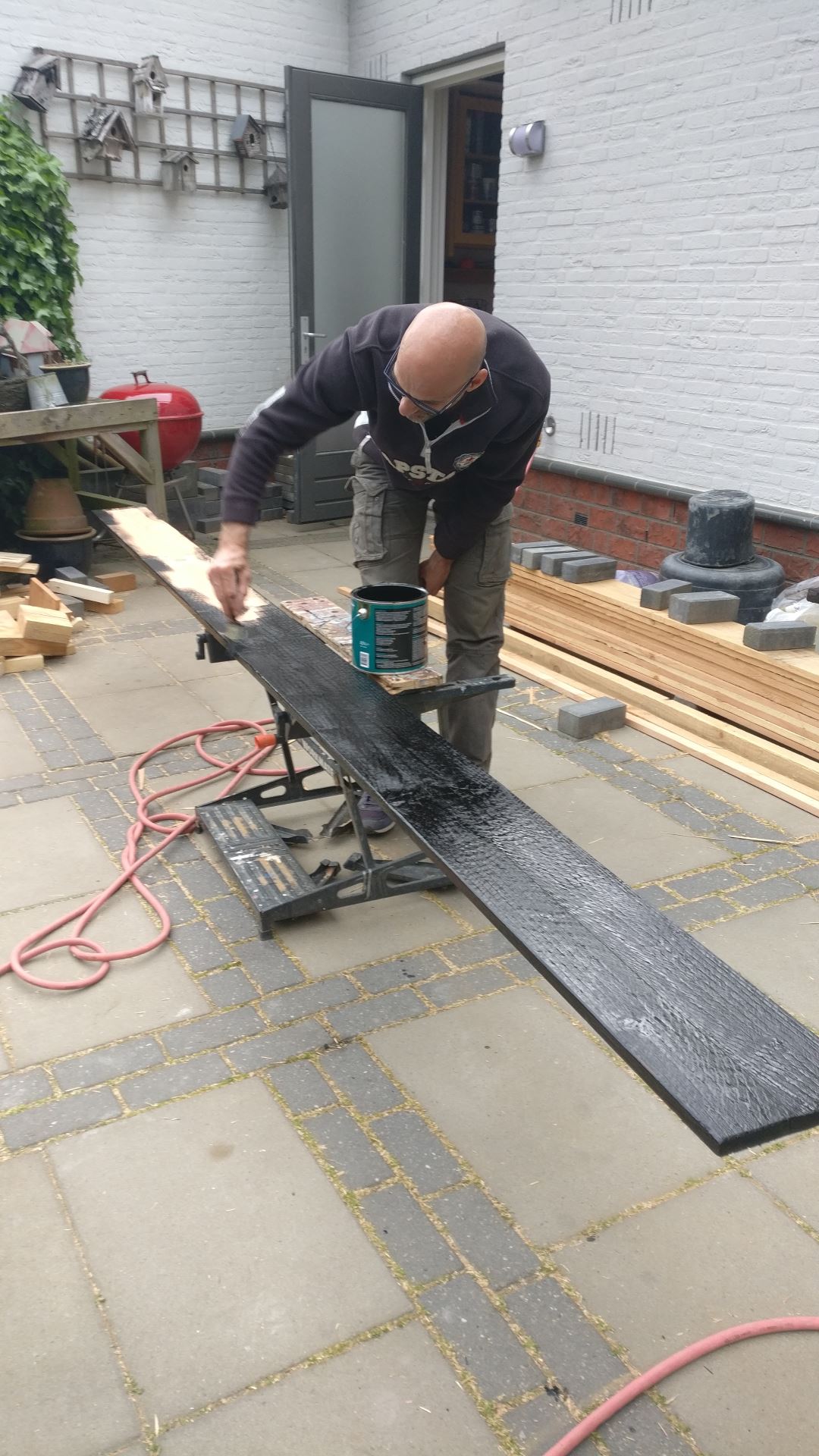 Potdeksel tijd! Een batch potdeksel planken moeten de achterwand van de overkapping gaan vormen. Ik vind zwart een mooie kleur voor deze planken. Ik twijfel nog even over hoe ze te kleuren. Na wat onderzoek blijkt zwarte teer de meest economische en onderhoudsvriendelijke