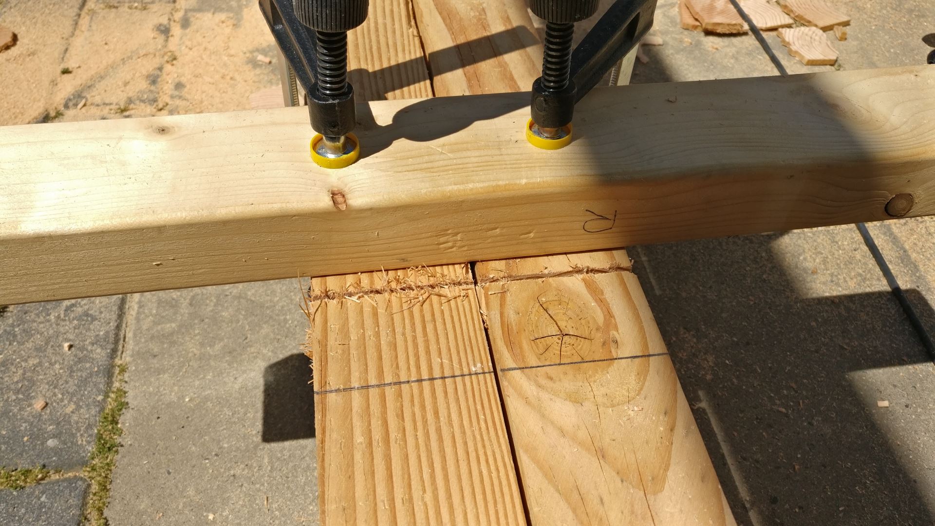 Nadat ik de lange liggers er weer af heb gehaald, klem ik deze met wat lijmtangen strak tegen elkaar zodat ik beide balken tegelijk kan inzagen. Hierdoor weet ik zeker dat de insparingen precies gelijk zitten. Om te beginnen teken ik