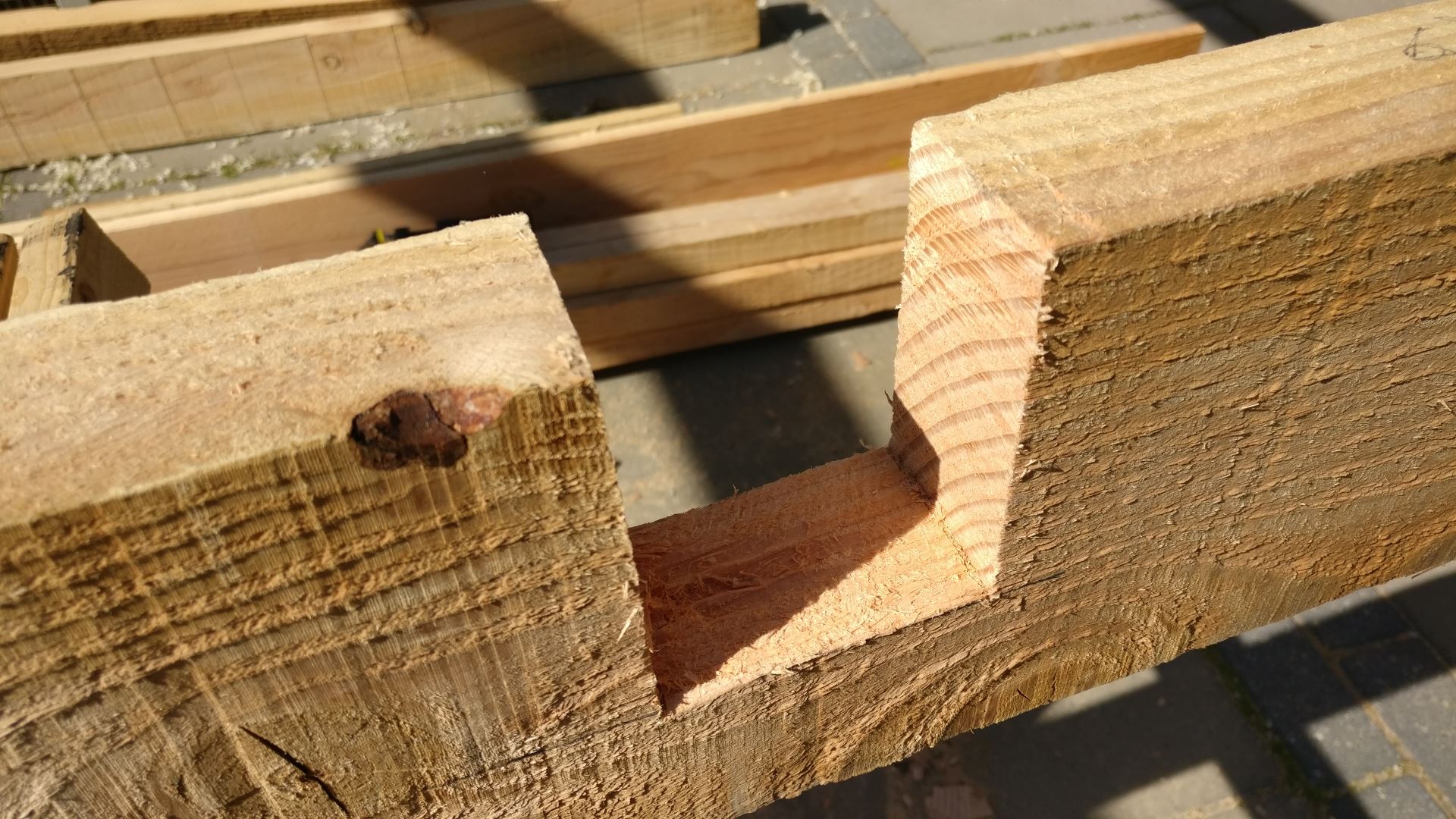 beide voldoende stevigheid te laten houden zaag ik zowel de liggers als de dakbalken in zodat ze precies in elkaar vallen. Omdat de liggers de hoogste belasting krijgen zaag ik deze iets minder ver in dan de dakbalken. Een bijkomend voordeel