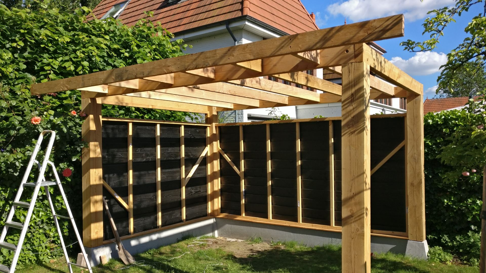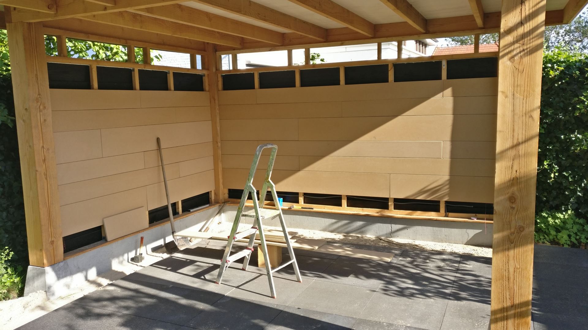 En wederom ben ik erg tevreden met het resultaat! Eigenlijk jammer dat dit de achterkant van de overkapping is en dat weinig mensen hem zullen zien. In het originele ontwerp had ik gewone witte panelen bedacht voor de binnenwand, maar daar ben ik niet