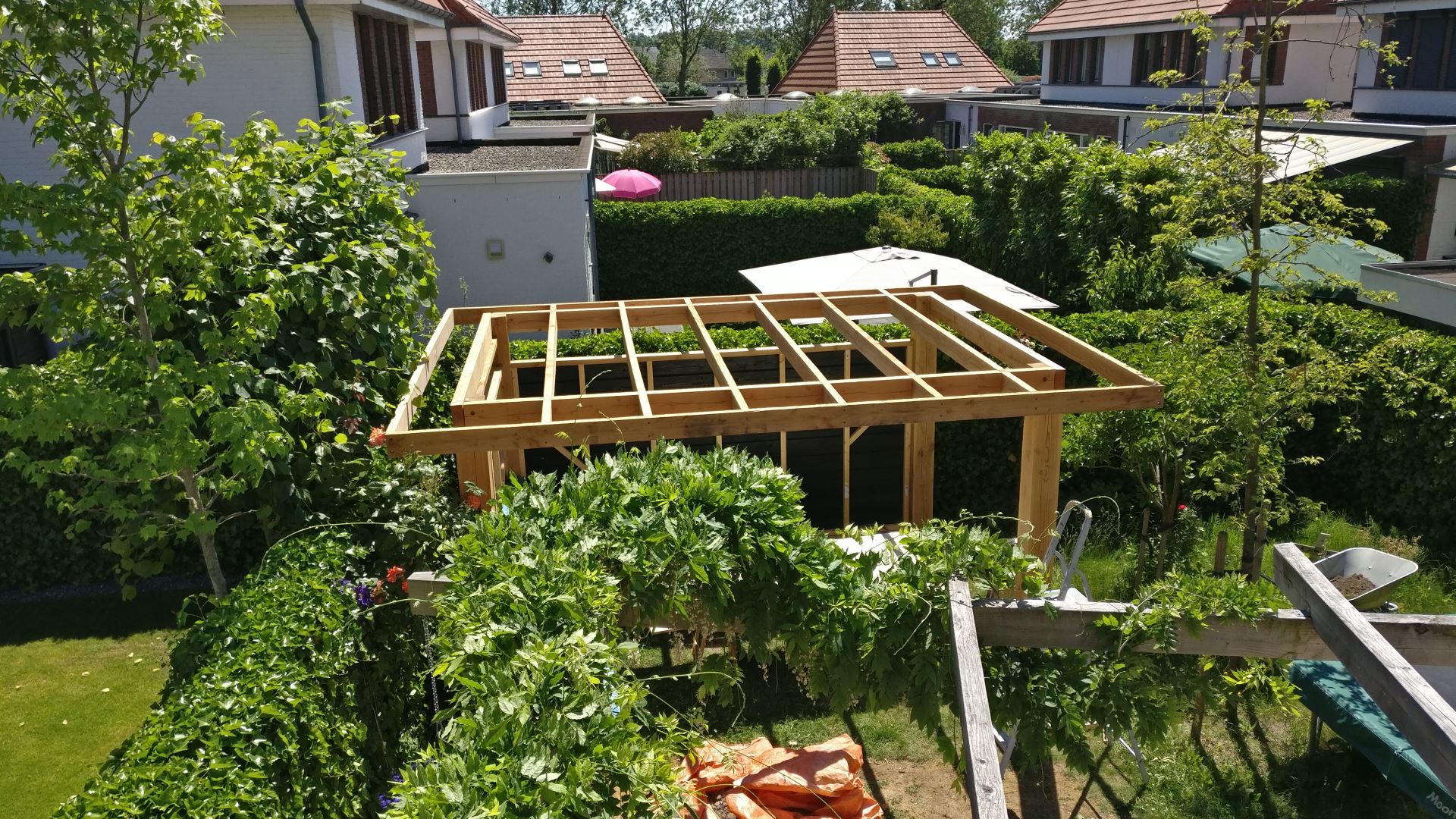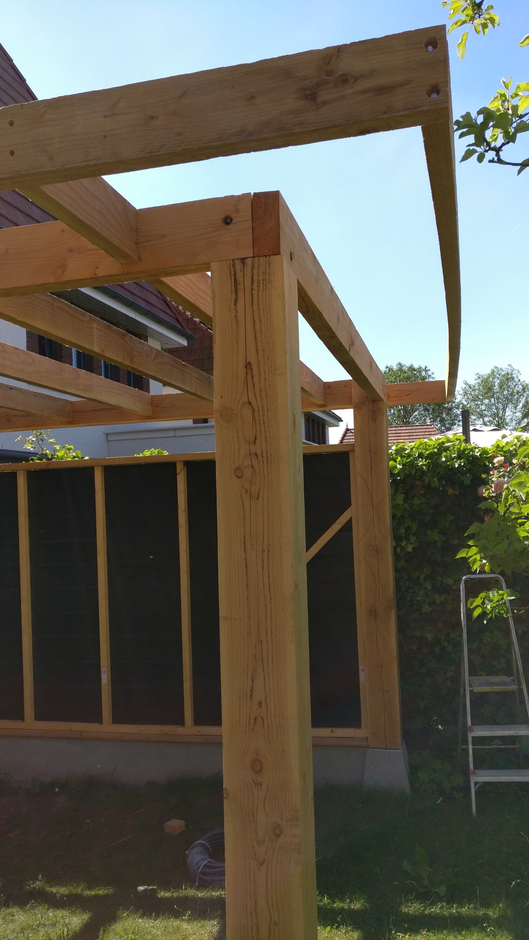Dit is het punt dat een vriend binnen komt en vraagt waar de afwatering komt... Ik ben me vanaf dag 1 bewust geweest van het feit dat het dak op afschot moet liggen. Ik had daar met de 4 palen op lengte zagen rekening mee moeten houden.