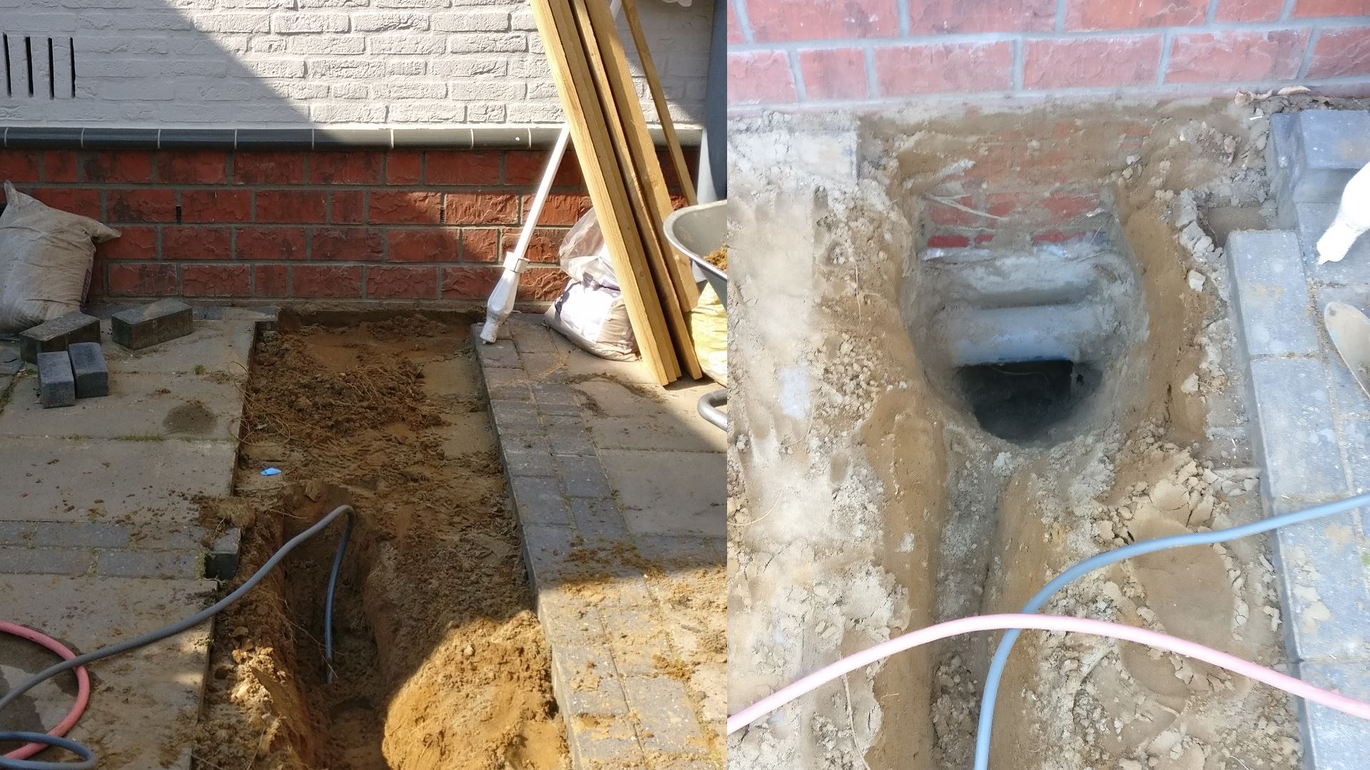Weer even tijd om de electriciteitskabel naar de meterkast te brengen. De kabel moet onder of door de fundering. Een gat erdoorheen boren sprak me niet zo aan. Maar vanuit de tuinkant kom ik niet echt veel dieper om de simpele reden dat