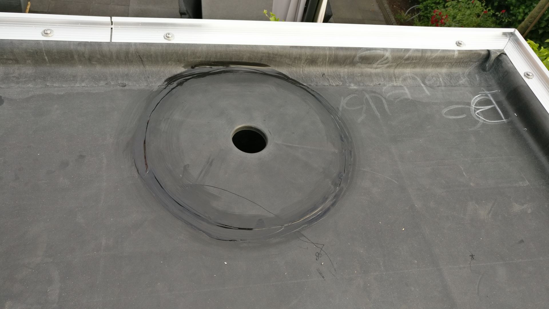 Als laatste stap een hemelwaterdoorvoer monteren. Van onderaf met een gatenzaag een rondje uit het hout zagen. Van bovenaf met een hobbymesje de EPDM wegsnijden. 4 ringen met EPDM kit rond de opening. De hemelwaterdoorvoer door het gat en van binnenuit