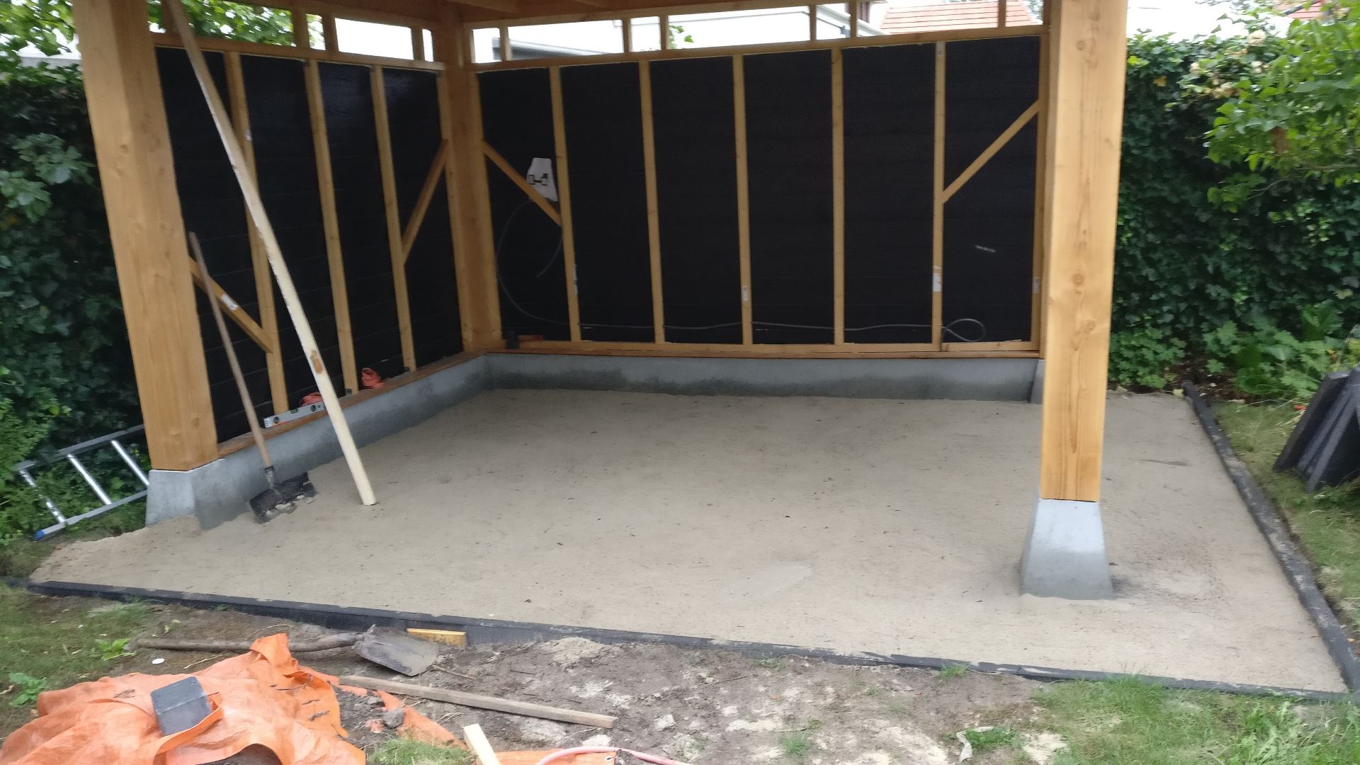 Nadat het zand er grof in geschept was heb ik in de linker-achterhoek van de overkapping een hoogte uitgezet welke 5cm hoger dan de rest van de tuin. Hierdoor zal eventueel water niet onder de overkapping blijven staan. Als je goed naar de foto hieronder