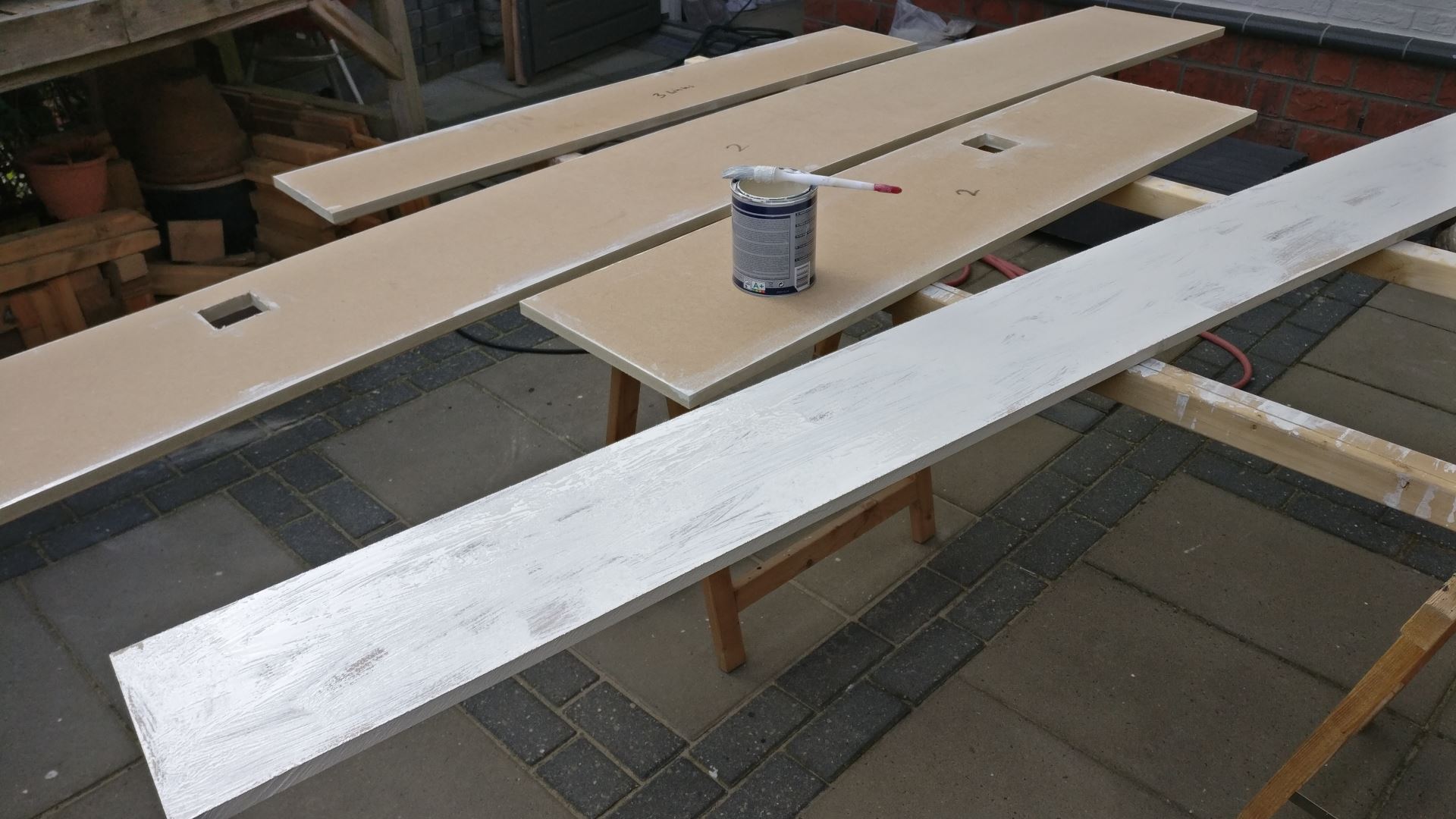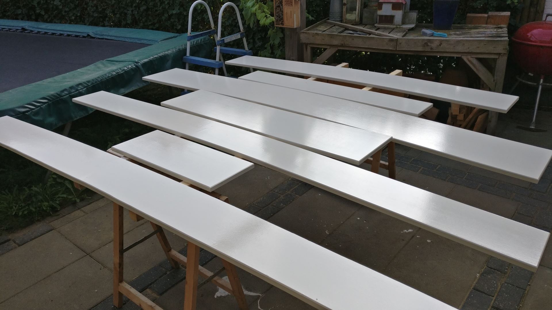 Vanwege de beperkte droogruimte in de garage, en een tussenliggende vakantie heeft het schilderen zo'n 5 weken doorlooptijd gehad. Na een week of 3 had ik de panelen van de korte zijde af en heb ik deze alvast bevestigd.