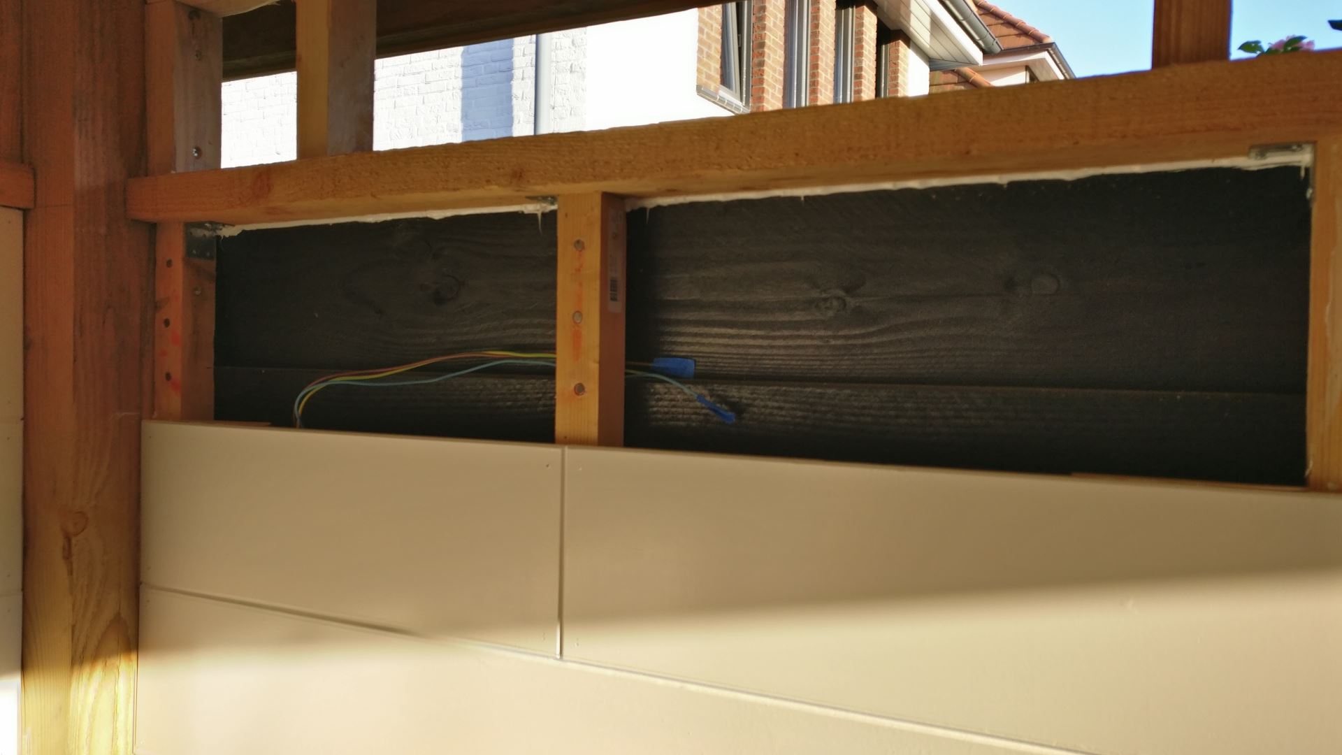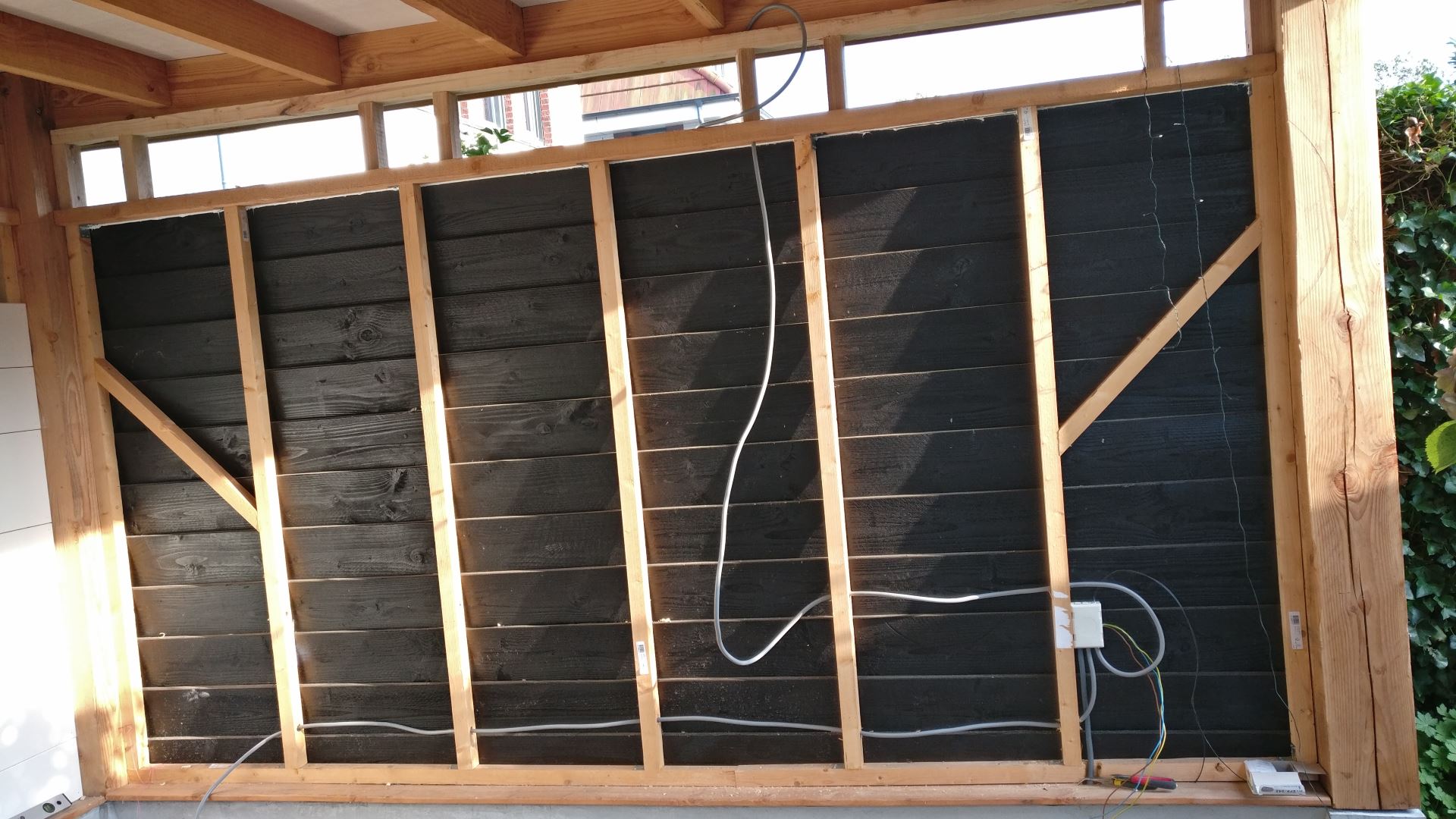 voor de verlichting door de liggers en een korte staand blokje. In die bovenste rand van de overkapping komen later nog glas-plaatjes in.