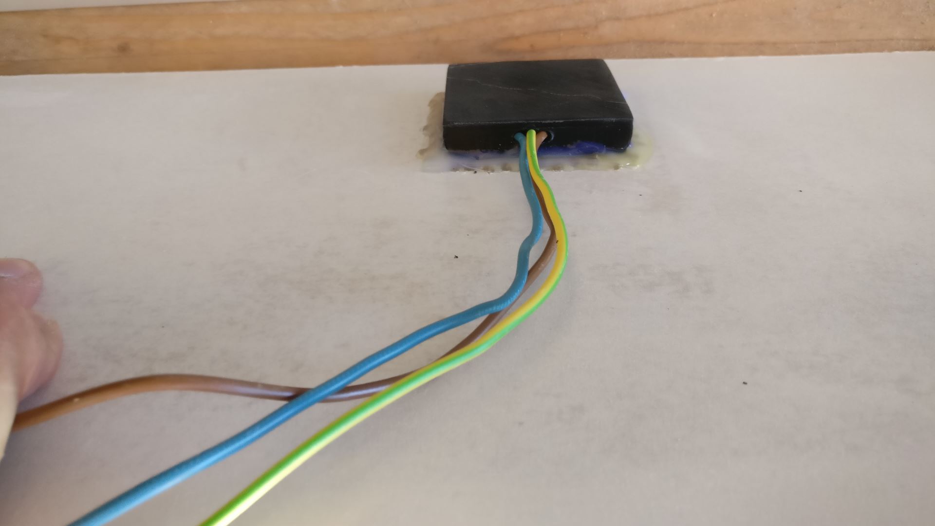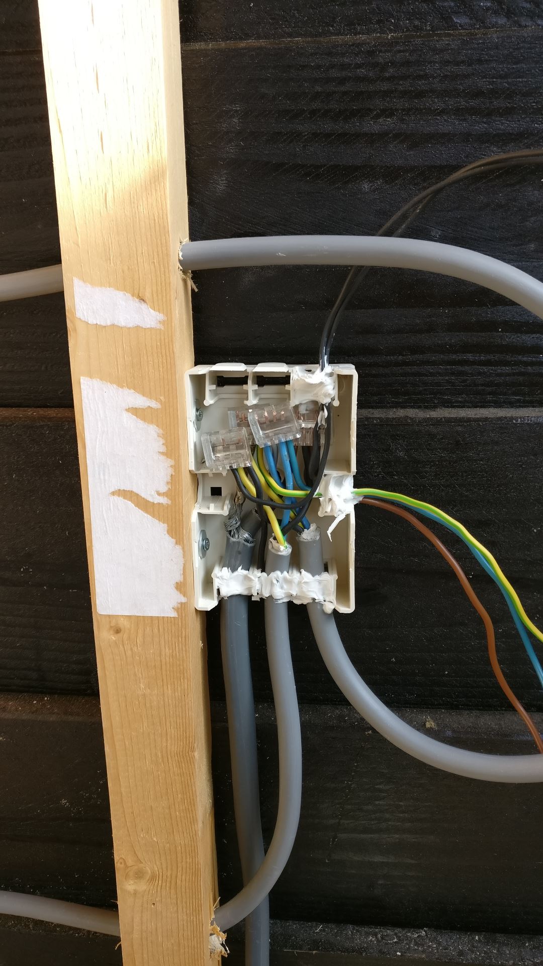 Hier wat fotootjes met van de elektra. De zwarte aders welke bovenuit het verdeel kastje komen zijn de gaan naar de schakelaar voor de verlichting. De geel/blauw/bruine aders gaan naar een stopcontact. Het meest rechtste plaatje laat zien hoe ik de kabel