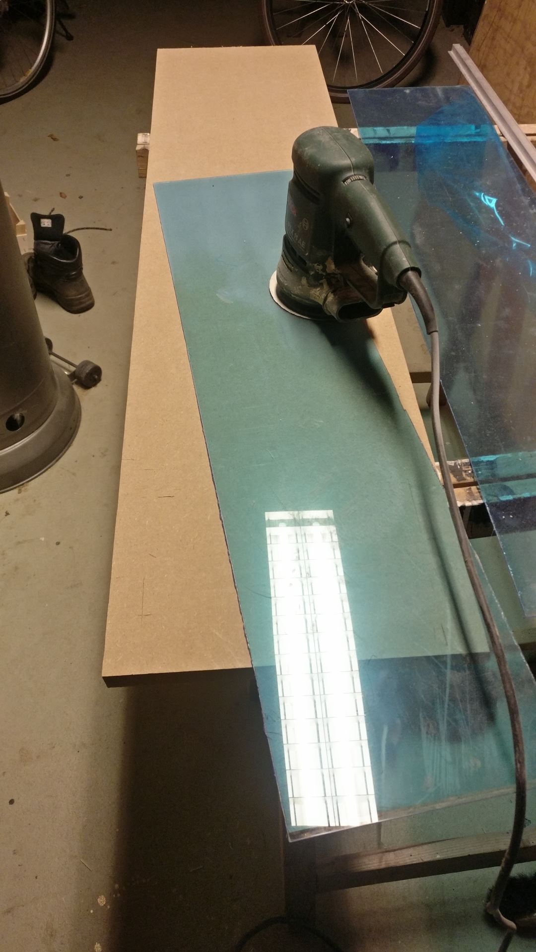 omdat de ruitjes puur estetisch zijn en geen enkele vorm van belasting zullen ondergaan heb ik besloten om plexiglas te gebruiken. Zo'n plaat is goedkoop en is makkelijk op formaat te snijden. Met een vlakschuur machine met fijn schuurpapier