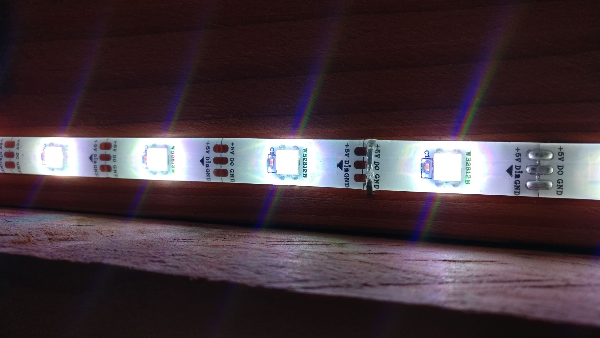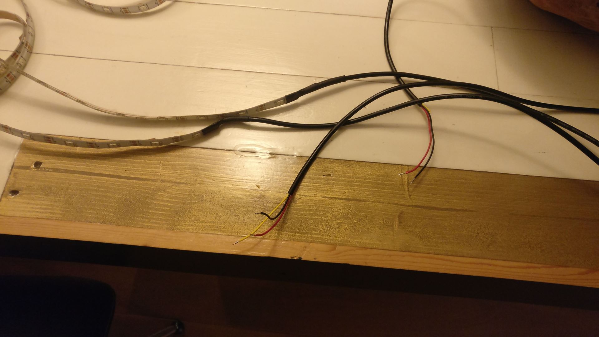 naast de LED strips te leggen heb ik uiteindelijk alleen de uiteinden van spanning voorzien. Bij alles wit kun je halverwege wat kleurverloop zien, maar het is acceptabel.