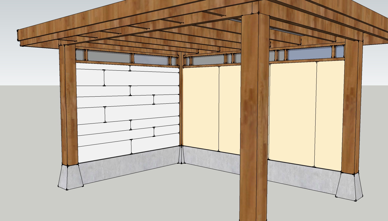 Het idee om de tuin aan te pakken en een overkapping te maken. Na wat grasduinen op internet voor ideeen kwam een houten overkapping met een betonnen onderrand al snel naar boven. Sketchup werd ingeroepen om een ontwerp mee te maken.